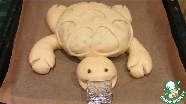 Затем формируем панцирь: Средний шар теста раскатываем в блин по размеру "тела", вырезаем в панцире небольшие кружочки.