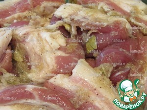 • Каждый кусок сала хорошо натереть со всех сторон специями с чесноком.