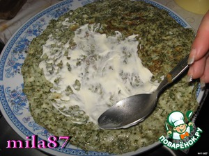 Каждый омлетик обильно смазываем сливочным сыром, затем наносим тонкий слой майонеза. (А можно майонезом смазать начинку).