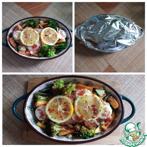Продукты все взвешены. У меня на порцию должно придти 150 г рыбы и 150 г овощей. Масла минимум. По желанию немного солим, я не солю.