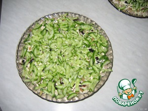 Огурцы также нарезать соломкой и уложить верхним слоем.