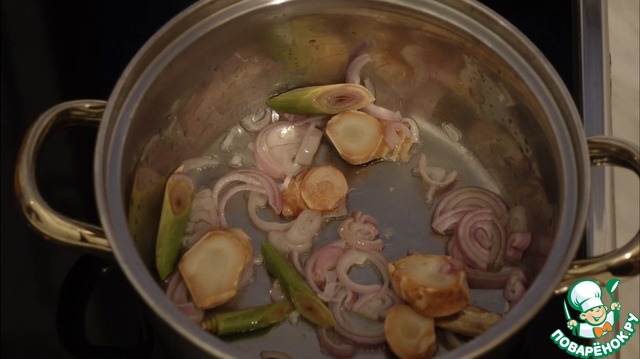 • Слегка обжариваем на растительном масле, лук, галангал и лемонграсс