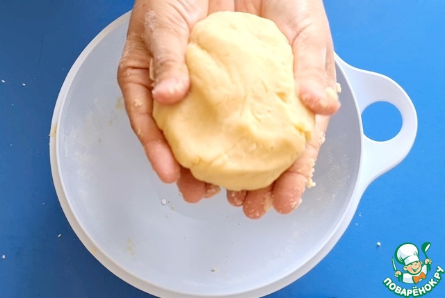 Для теста в большой миске соединяем все сухие ингредиенты: муку (её лучше просеять, чтобы избавиться от возможного мусора), сахарную пудру (если она в комочках, то её также стоит просеять), разрыхлитель. Лопаткой или просто рукой тщательно перемешиваем все компоненты, чтобы получилась равномерная смесь. Добавляем сливочное масло и руками перемешиваем. Затем добавляем 2 желтка и замешиваем тесто. Оно должно получиться в меру плотным и не липким. Делим его на 2 части так, чтобы одна из них была чуть больше другой.