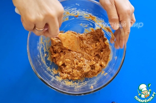 Займемся начинкой для пирога. Готовую вареную сгущенку перекладываем в емкость для работы и добавляем к ней белок, перемешиваем и добавляем грецкие орехи. Перемешиваем.