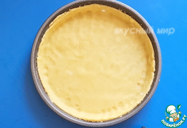 Больший кусок теста раскатываем. Переносим его в форму. Форма у меня 24см. Смазываем форму сливочным маслом. Тесто аккуратно распределяем по поверхности, формируя невысокие бортики.