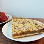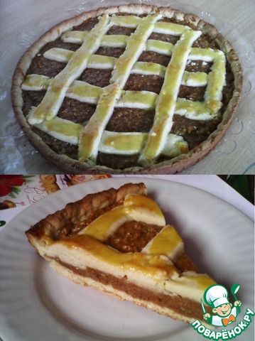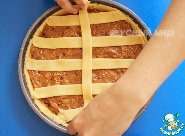 Наносим слой начинки из вареной сгущенки и грецких орехов. Разравниваем лопаткой. Меньший кусок теста раскатываем и разрезаем на полоски. Украшаем полосками теста верхушку пирога. Смазываем пирог желтком.