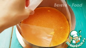 Корж выкладываем на подставку где будем формировать мороженое, на него одеваем кольцо плотно скрепляем и на борта формы выкладываю плотные файлы или ацетатную пленку.