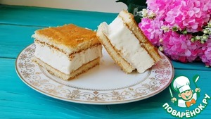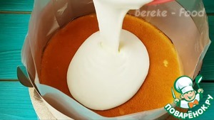 Далее заливаем сливочную массу и выкдаваем второй корж слегка придавливаем и отправляем в морозильную камеру на 5 часов.
