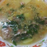Выкладываем пшено. Варим минуты 3, а затем добавляем сразу все овощи: картофель, лук репчатый и морковь. Всё порезано небольшим кубиком. Варим до готовности. Кладём душистый перец и лавровый лист, солим по вкусу.