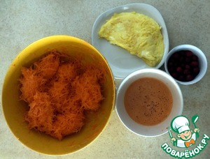 Готовим морковную основу салата. Для этого к отжатой моркови добавляем измельченную в пюре клюкву с морковным соком, натертый на мелкой терке чеснок, поджаренный лук со специями. По вкусу солим. Стабилизируем кислотность добавляя сок облепихи по вкусу. Добавляем масло виноградной косточки (или любое другое масло холодного отжима). Хорошо все перемешиваем вилкой и храним в закрывающейся коробочке/чашке в холодильнике 1-2 дня.