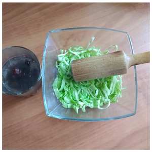 Изюм запариваем кипятком минут на 5. Листья капусты скручиваем рулончиком и очень тонко нарезаем длинной лапшой. Так в салате она будет красивее смотреться. Помещаем капусту в салатник и присаливаем немного. Деревянной мялкой бьём, чтобы капуста дала сок. Молодую капусту бить сильно не нужно, она очень сочная и хрустящая!