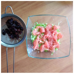 Изюм откидываем на ситечко, чтобы слилась с него вся жидкость. С грейпфрута снимаем кожицу, а белые плёнки убираем прямо над салатником, чтобы сок с него не пропал. Разбираем пальцами на кусочки.