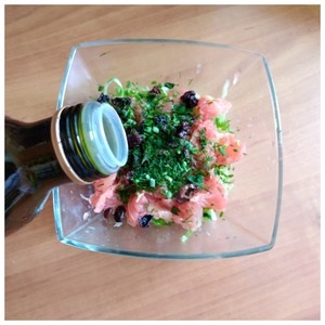 Добавляем изюм и мелко порезанный укроп свежий. Заправляем маслом. Пробуем на соль. Солите по вкусу. Можете поперчить любимым перцем.
