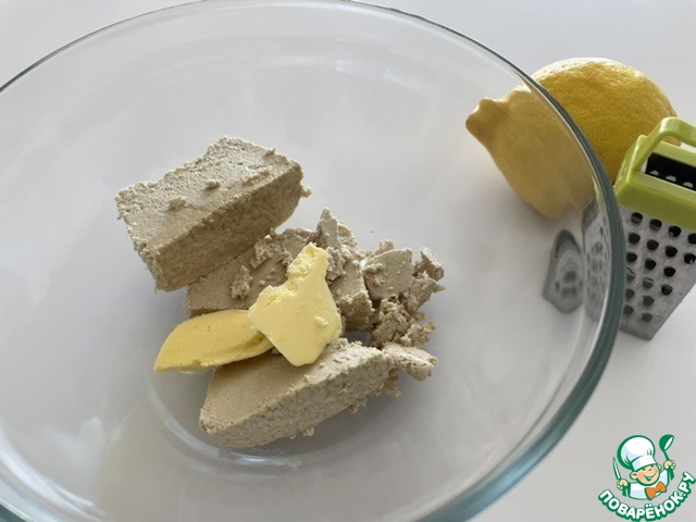 Включаем духовку на 200 градусов, режим «верх-низ». В ёмкости разминаем вилкой халву и сливочное масло, натираем цедру лимона, выжимаем сок. Лимон берем в количестве равном двум долькам, используемых для чая.