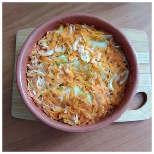 Между голубцами выложила порезанную капусту вперемешку с начинкой оставшейся. Сверху покрыла второй половиной лука и моркови. В стакане развела протёртые томаты, сметану и куриный бульон. Посолила по вкусу. Залила равномерно форму с содержимым. Накрыла фольгой. Поставила в духовку на 40 минут при т-180 С. За 10 минут до окончания запекания я сняла фольгу. пусть верх немного подрумянится. Ориентируйтесь на свою духовку.