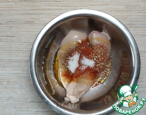 Филе курочки обсушиваю полотенцем, чтобы сок был только от трав и перца. Мясо кладу в глубокую миску и сразу добавляю смесь из прованских трав, сушенных томатов и паприки