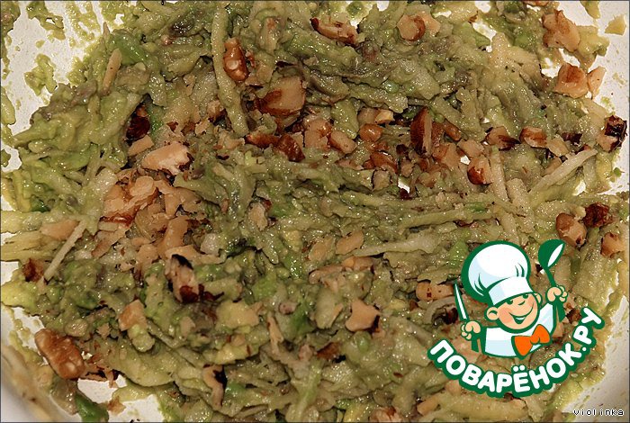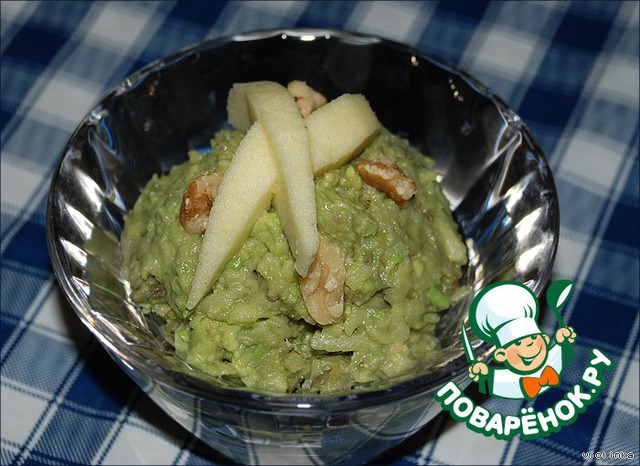 • Очистим авокадо от кожуры, освободим от косточки и разомнём мякоть вилкой. На тёрке натрём яблочко без кожуры. Осторожно смешаем с авокадо. Присолим по вкусу. Мелко нарежем грецкие орехи. Всё смешаем.