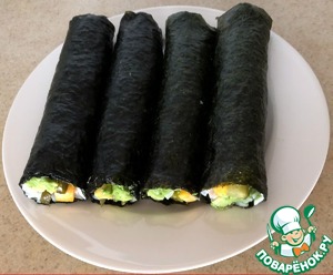 Затем начинаем заворачивать ролл, начиная со стороны заложенных ингредиентов. Частично влага перешла от риса к листу нори и он уже не такой сухой. По мере закручивания, постепенно убираем пленку.