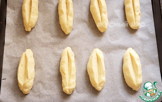Тесто делим на части. Взять одну часть и раскатать в небольшую лепешку и формируем лодочки. Делаем надрезы и накрываем пищевой пленкой, оставляем на минут 20.