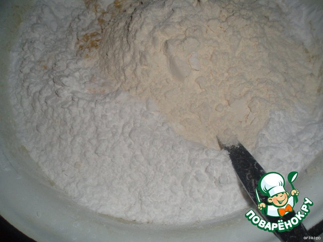 Отдельно соединяем соду, крахмал, муку, затем постепенно добавляем к яично-маслянистой смеси
