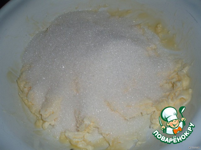 Масло растереть с сахарной пудрой (у меня был сахар) и ванилью.
