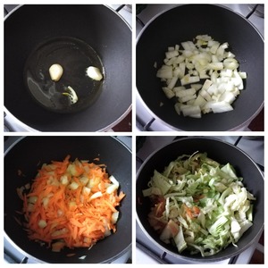 • Продукты все взвешены. Берём сотейник, где будем готовить капусту. Чтобы масла взять по минимуму, нужно посуду антипригарную. Наливаем масло, греем его и выкладываем дольки чеснока, разрезанные пополам. Обжариваем с минуту, чтобы они отдали свой аромат маслу и убираем их. Кладём лук, порезанный произвольно. Золотим его чуть до мягкости и добавляем к нему морковь. Перемешиваем, наливаем 2 ст л воды, убавляем огонь, накрываем крышкой и тушим пару минут. Выкладываем нашинкованную капусту. Тушим на минимальном огне под крышкой до готовности. Молодая капуста готовится очень быстро.