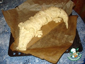Там где планируется морда, оставляем побольше теста, где хвост - поменьше. Лоскутики теста переплетаем косичкой в нахлест, хвостик закручиваем, морду надо приплюснуть (но аккуратно, не забываем, там начинка), вырезаем из теста лапки и прикручиваем их к туловищу. Последний штрих - по готовому крокодильчику проходимся ножницами, имитируя рельефность шкуры.