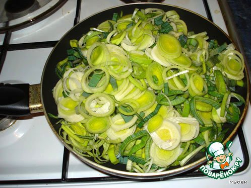 1. Режем кольцами лук порей, тушим на оливковом масле с добавлением молока