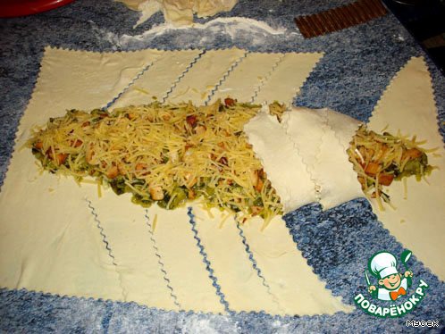 На раскатаное тесто выкладываем начинку, посыпаем сыром и начинаем подрезать тесто для последующего моделирования крокодила. Подрезку лучше вести специальным волнистым приспособлением для резки или ножницами.