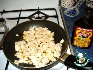 2. Отдельно обжариваем куриное филе (я взяла оставшийся постный куриный рулет), добавив в процессе жарки жидкий дым.