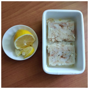 Все продукты взвешиваю, т к блюдо готовлю для своей диеты. Разморозила брикетики филе минтая и у меня получилось - 180 г. Взяла форму 11Х17 см. Обмазала её половиной масла. Выложила кусочки в форму, присолила совсем чуть-чуть, поперчила (если есть будут дети, то не перчите или тем, кто сидит на щадящей диете), полила соком лимонным и сверху ещё половиной масла. Поставила в духовку на 10 минут при т-180 С. Мне нужно, чтобы минтай схватился. Можно даже немного его подрумянить.
