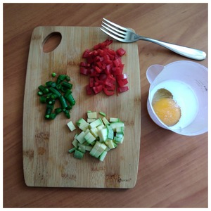 Овощи режем мелким кубиком. Готовим заливку. В кружке смешала яйцо со сливками, немного присолила.