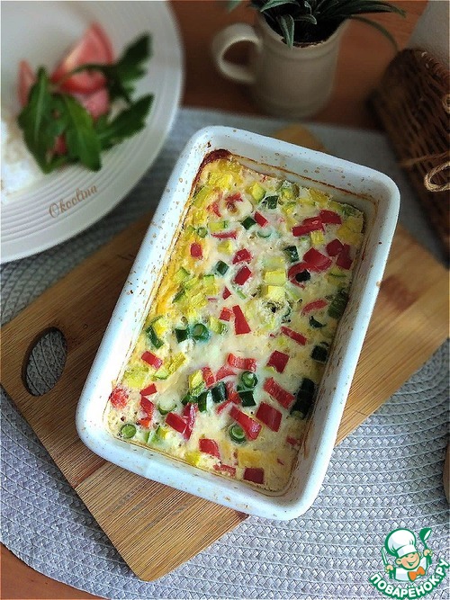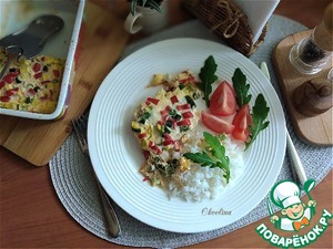 Равномерно залила рыбу по всей площади формы. Поставила в духовку на 15 минут при т-180 С. Мне этого времени хватило, чтобы омлет схватился и был красивый. Ориентируйтесь по своей духовке. У меня эл. шкаф на 18 л с элементами снизу и сверху. Печёт очень быстро.