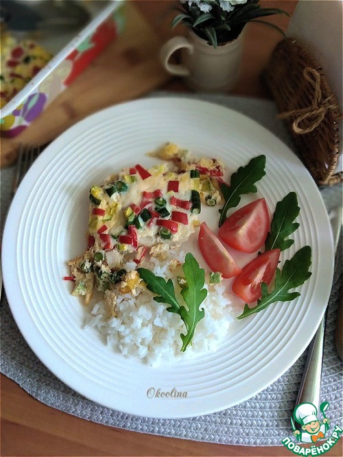 Так как я готовила это блюдо на второе, то подам его с рисом и украшу помидоркой и рукколой.