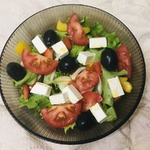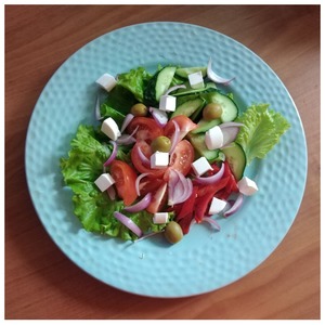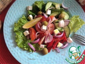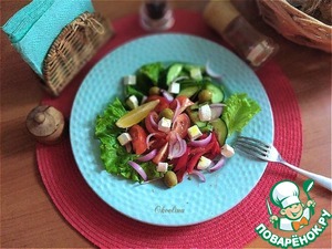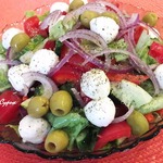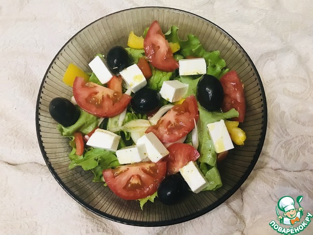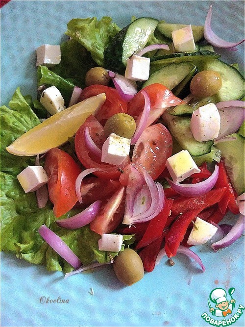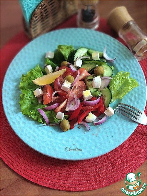 Да может и сам "Греческий"? Салат делала на ужин для диеты. Всё подсчитано: и вес продуктов; и калории на одну порцию. Может кому-то и пригодится! Конечно же это замечательный салат!