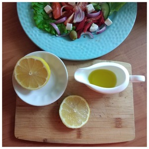 Делаем заправку. Лимонный сок отжимаем в оливковое масло и соединяем. Поливаем равномерно собранный салат.