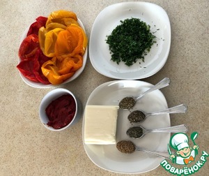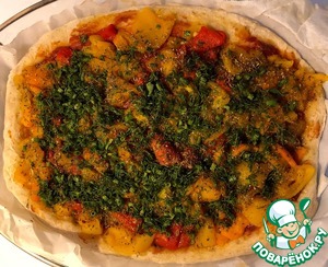 Равномерно распределяем кусочки перца и посыпаем укропом и специями. По желанию, можно взять меньше специй. Выпекаем в духовке (полка ближе к вверху, нагревание снизу) при 175С в течении 20 минут. Предварительно духовку не разогревала.