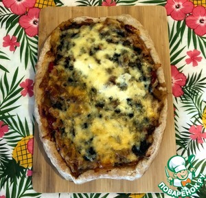Делюсь своим семейным рецептом пиццы. Запасенный с осени, запеченный и замороженный сладкий перец позволяет делать эту пиццу в любой зимний день и радовать нас его сладким вкусом. Большое количество печеного перца делает это блюдо не только ароматным, сладковатым, но и достаточно полезным. Она полезнее обычной пиццы, так как тесто приготовлено из смеси неотбеленной пшеничной муки и цельнозерновой муки; начинка содержит больше перца, не содержит какие-либо копчености, и сыр не запекается под прямым нагреванием верхней спирали духовки. Меньше транс-жиров образуется, так как сыром это блюдо посыпается за 10 минут до готовности, чтобы он расплавился, но не пересыхал (чтобы из него жир не отделялся как в обычных покупных пиццах). Это блюдо получается немного сладковатым за счет перца и пряным за счет специй.