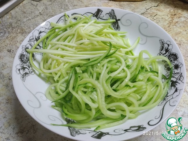 Нарезаем кабачки и свежие огурцы тонкой соломкой, перекладываем в дуршлаг и присаливаем. Оставляем минут на 10, чтобы стекла лишняя жидкость.