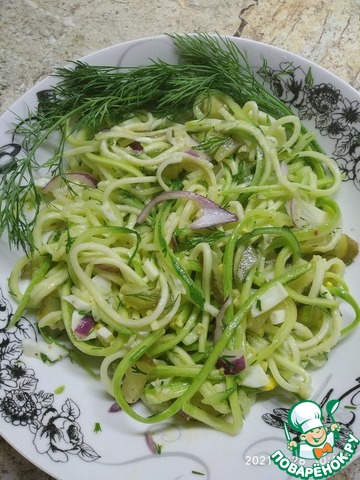 Нарезанные кабачки и огурцы слегка отжимаем, перекладываем все ингредиенты в большую миску, поливаем заправкой и аккуратно перемешиваем. Я добавляю еще свежий укроп, но он необязателен.
