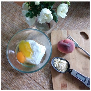 Все продукты взвешены. В посуду выложила творог 5 %, мёд, разбила яйцо, положила сметану. Соединила. Творог у меня однородный, если он крупинками, то лучше его перетереть. У персика убрала косточку.