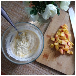 Порезала персик мелким кубиком. Добавила в смесь кукурузную муку. Тщательно перемешала и выложила кусочки персика.