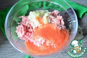Измельчить мясо на мясорубке, дважды пропустив через среднюю решётку, затем лук, чеснок и помидор.