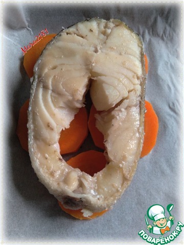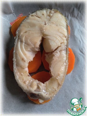 Противень застелить листом пергамента, на который в начале выкладываем кольца отварной моркови (5-7мм толщиной). У меня для 1 стейка трески морковная "подушка" состоит из 5 кружков (ориентироваться на размер самого стейка). При необходимости рыбу подсолить (хотя я этого не делаю, мне достаточно по соли, когда она отваривалась в воде). Совсем немного присыпать чесночным порошком.