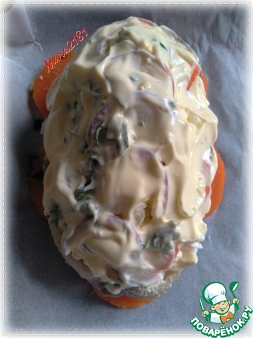 Добавить немного молотого чёрного перца и покрыть тонким слоем домашнего майонеза (или сметаны).