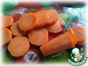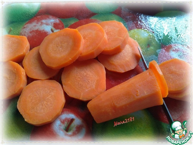 2-3 моркови среднего размера (общим весом около 300 г) очистить, промыть и отварить в кипящей воде около 10 минут. Дать остыть, затем половину моркови нарезать кружочками 5-7 мм толщиной. Оставшуюся половину моркови нарезать тонкими кружками.