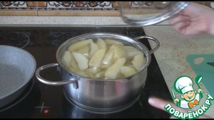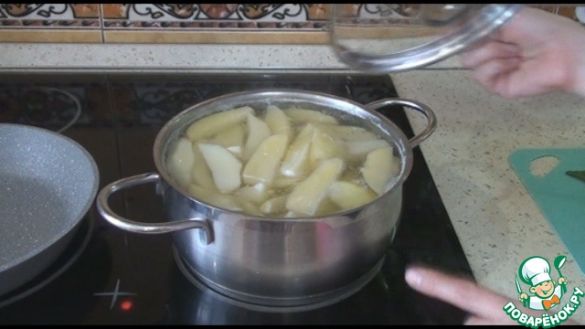 Картофель почистить, нарезать средними кусочками и отварить в подсоленной воде до готовности.