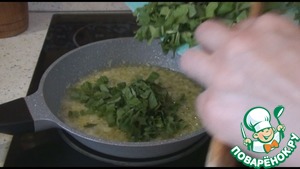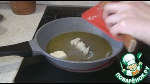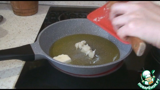 На сковороду наливаем растительное масло, добавляем сливочное. Выкладываем чеснок и обжарим одну минуту.