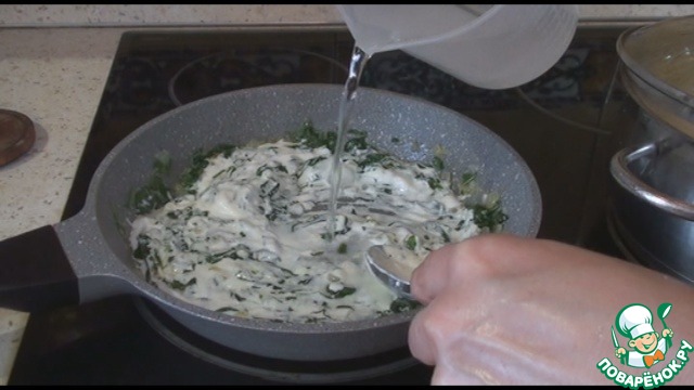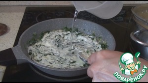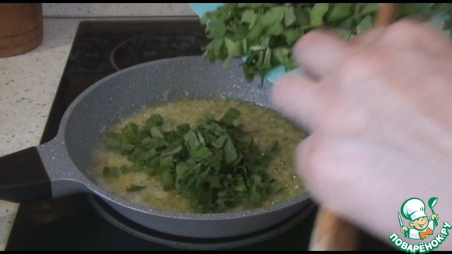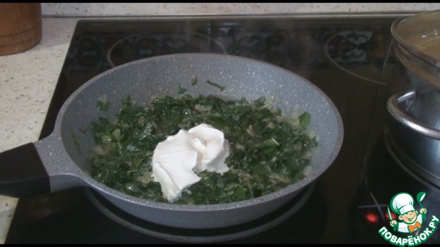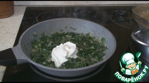 Потом выкладываем лук, обжарим, чтобы стал прозрачным. Добавляем шпинат и обжарим одну-две минуты, чтобы стал мягким и пустил сок.