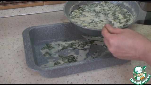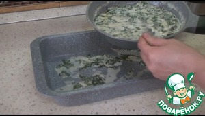 В форму для запекания выкладываем половину шпинатной заливки.